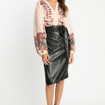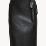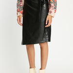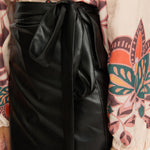 Introducing the Peyton Skirt, a knee-length wrap skirt crafted from sleek black vegan leather. Designed with a flattering pencil silhouette, it features adjustable side ties that allow for a customizable fit.
