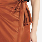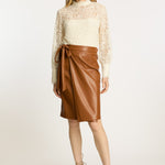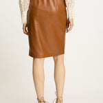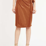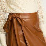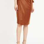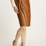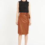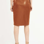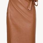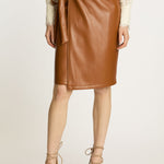 Introducing the Peyton Skirt, a knee-length wrap skirt crafted from sleek vegan leather in our rich Tobacco hue. Designed with a flattering pencil silhouette, it features adjustable side ties for a customizable fit.