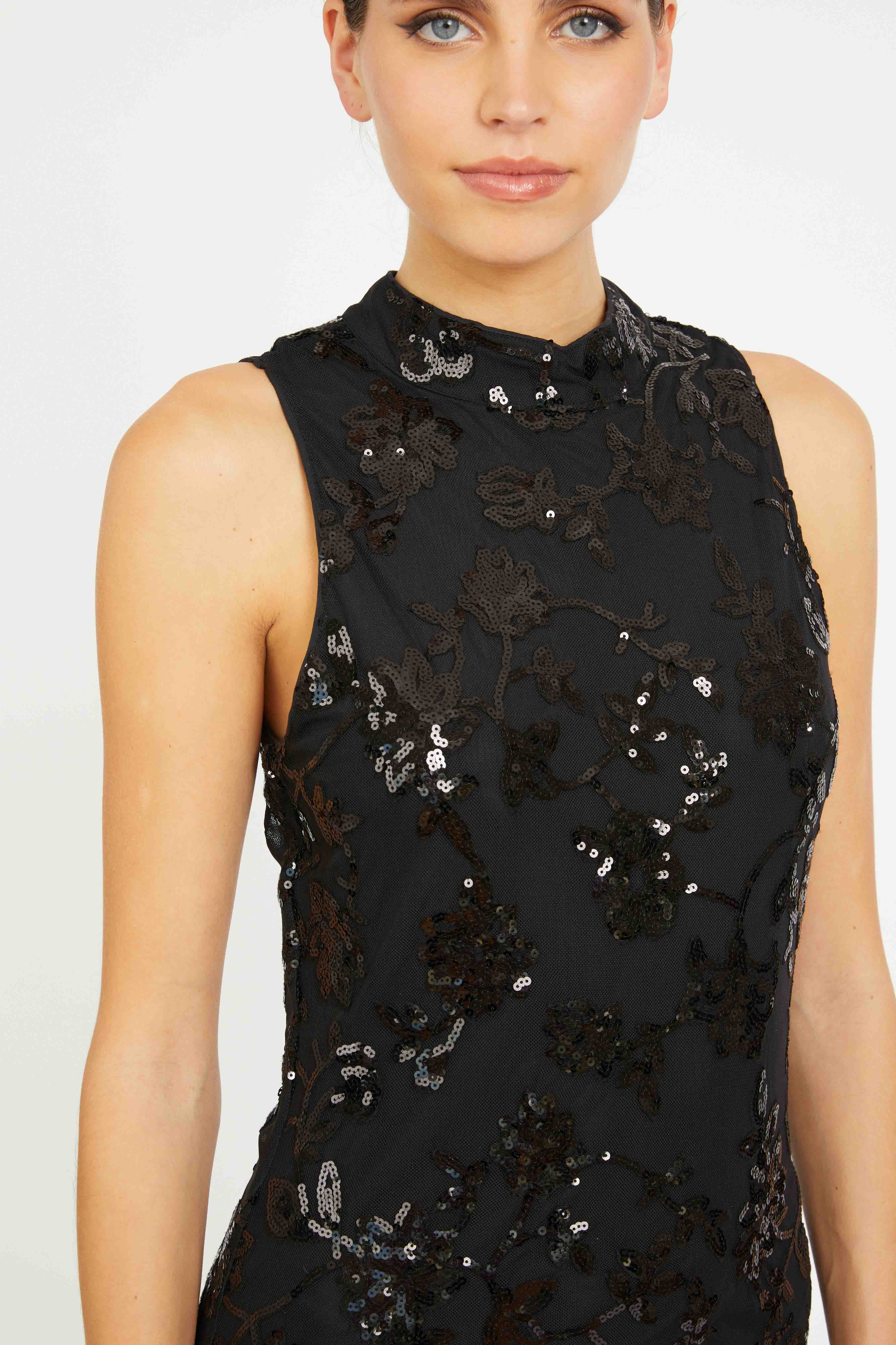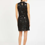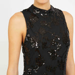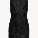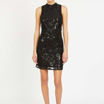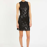 The Rayne Dress in Black Sequin Lace is a sleek, sleeveless mini dress that combines modern elegance with eye-catching detail. Designed with a high neckline and a tailored silhouette, it features intricate floral sequin embroidery layered over mesh for a striking play of texture and shine.