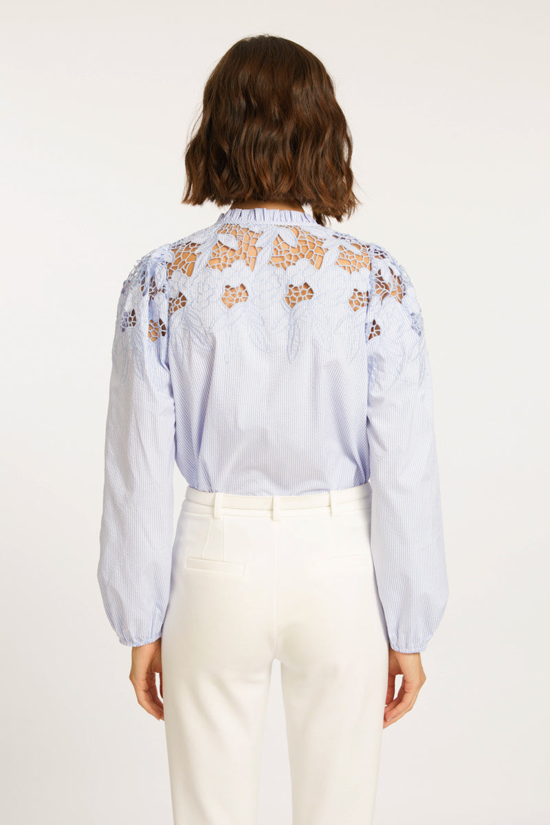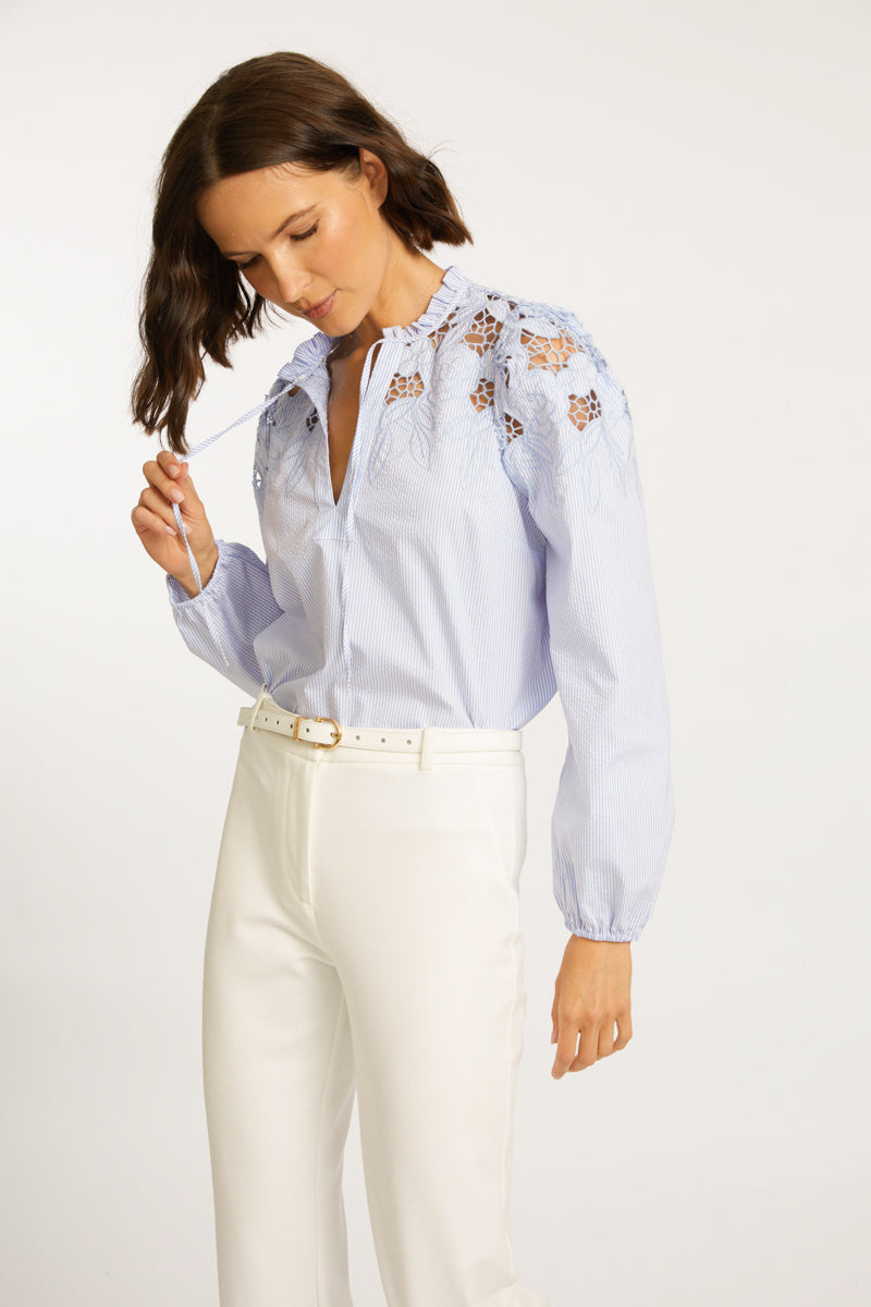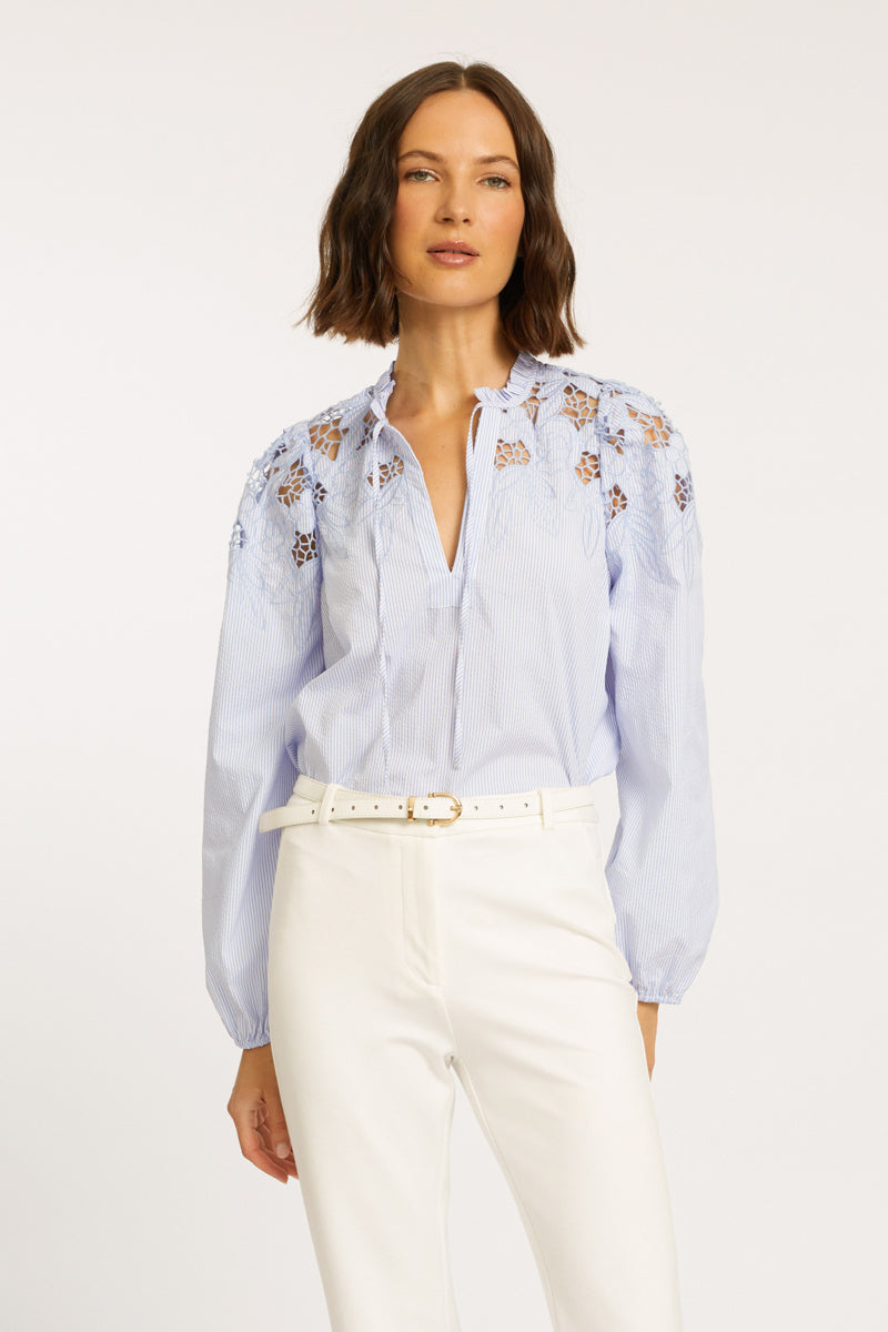 The Riana Top features a beautifully embroidered floral yoke at the shoulders, which adds an elegant touch that elevates the overall design. The long blouson sleeves provide both style and practicality for cooler days. Whether you're dressing it down with jeans for a casual outing or pairing it with a skirt for a more polished look, the Riana Top is versatile enough to suit any occasion.