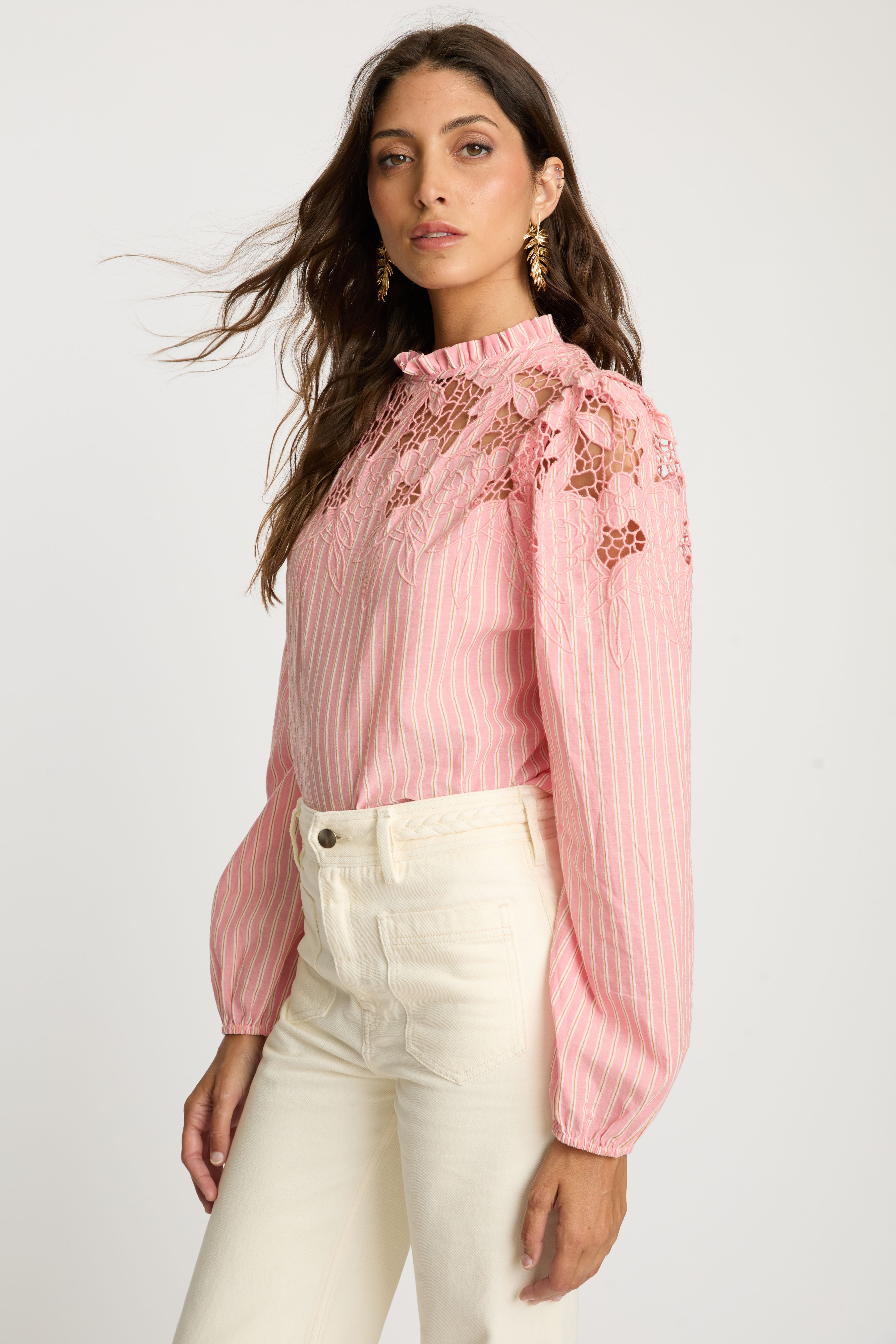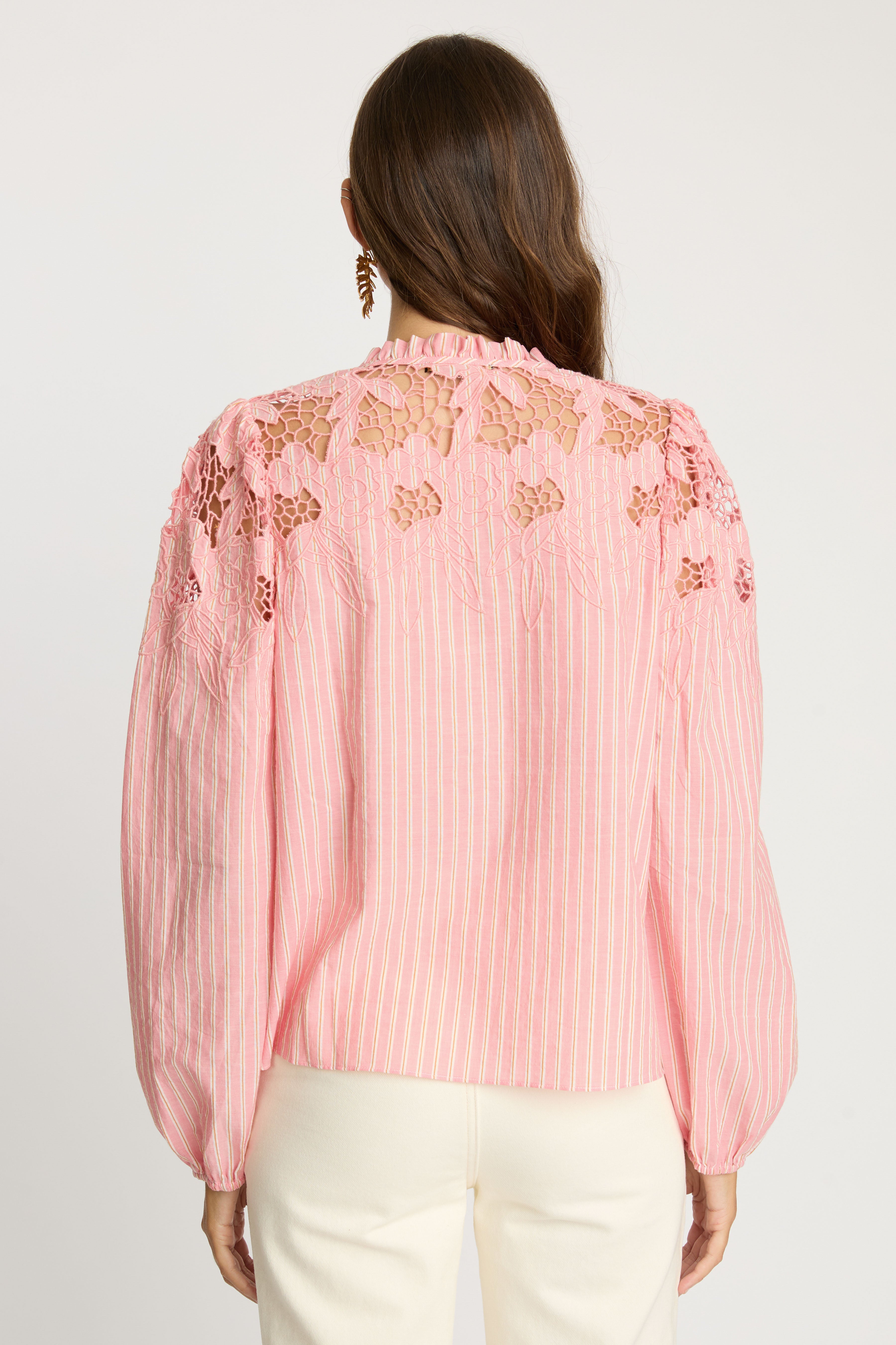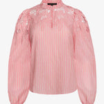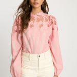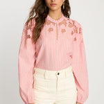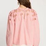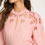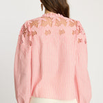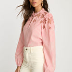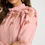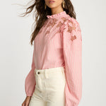 The Riana Top in Sunset Stripe is a romantic, versatile blouse designed for effortless style. Crafted from lightweight fabric featuring subtle vertical stripes in a soft pink hue, it creates a refined, textured base for the standout details.