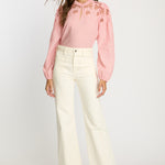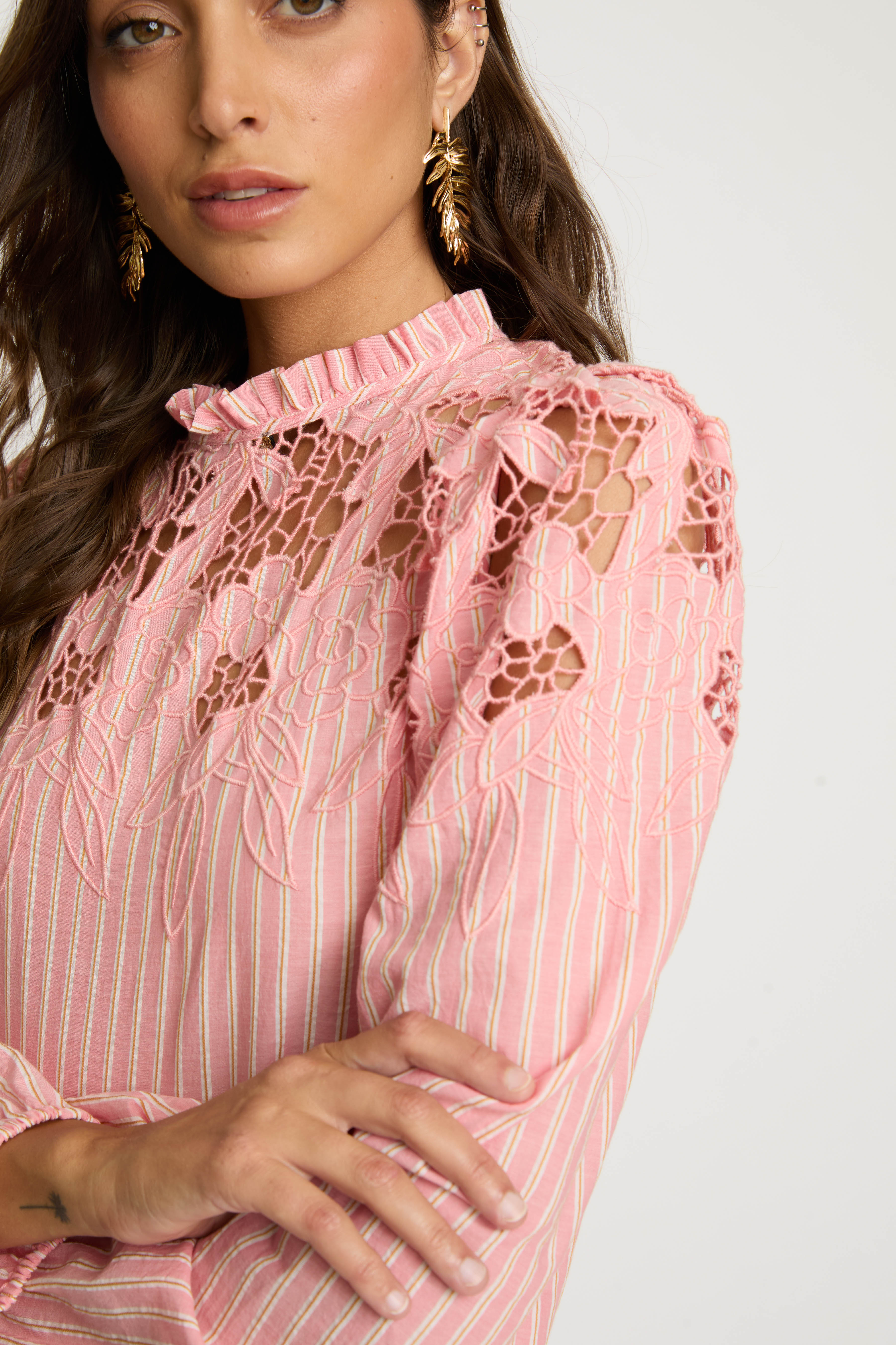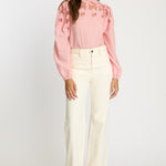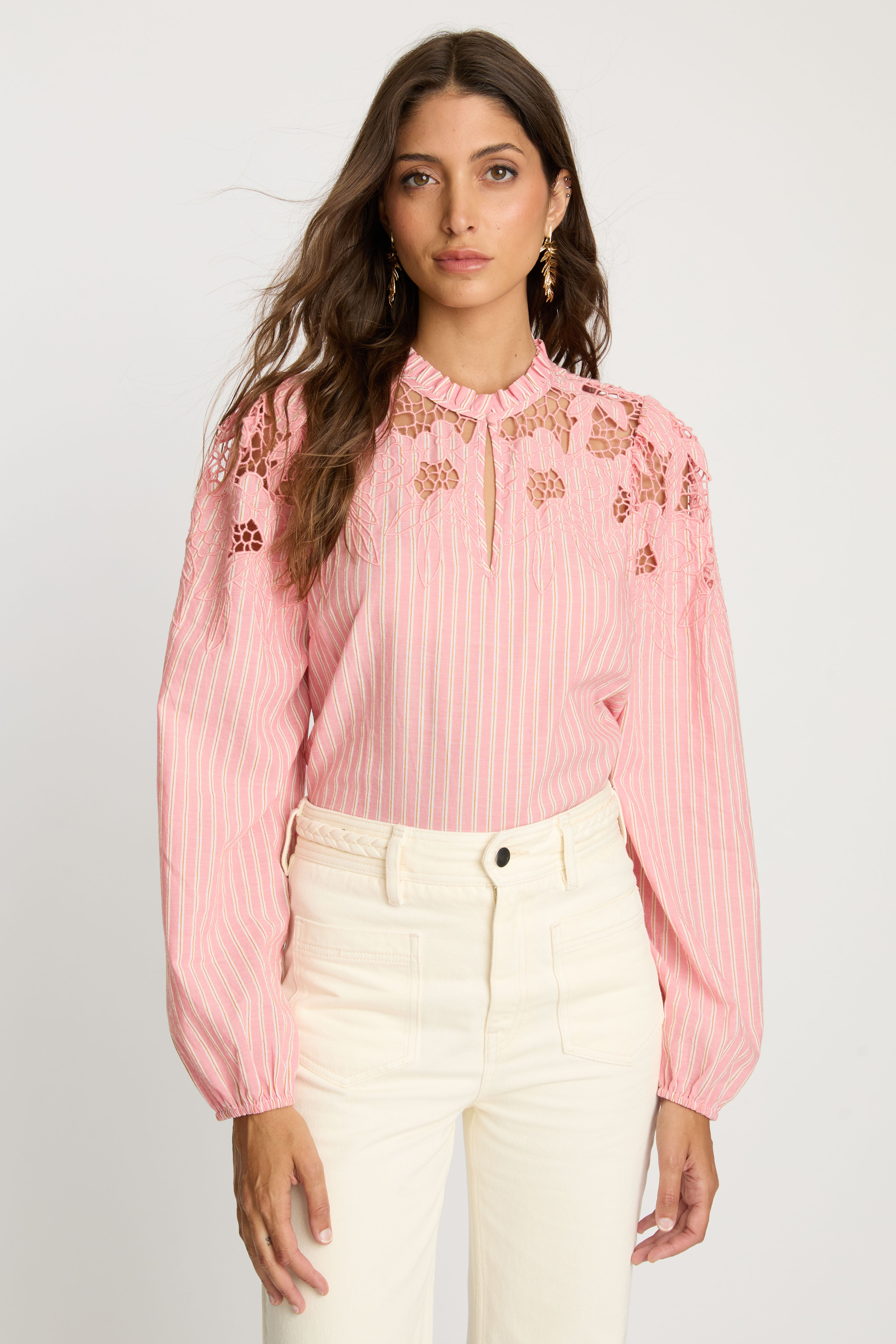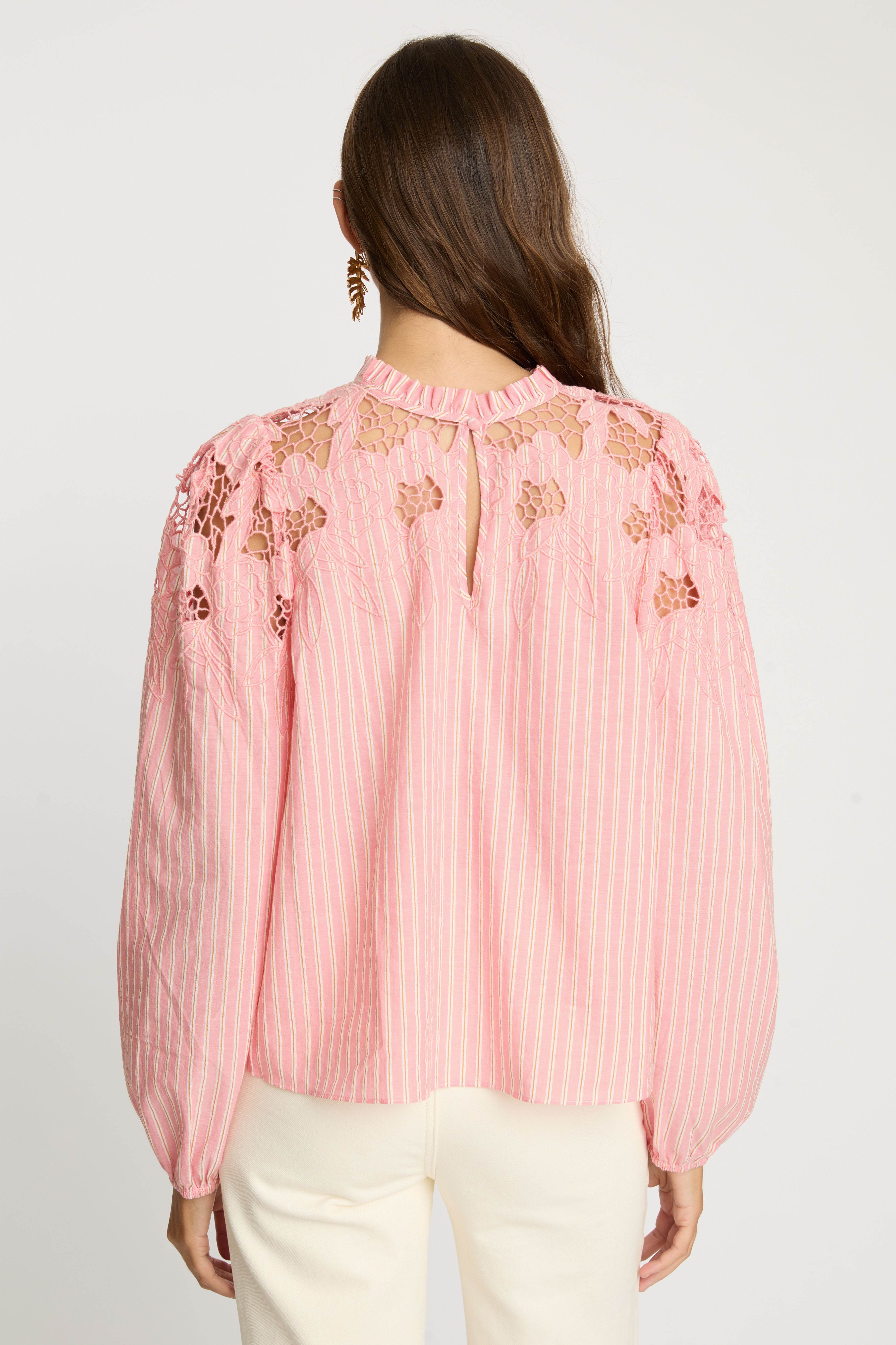 The Riana Top in Sunset Stripe is a romantic, versatile blouse designed for effortless style. Crafted from lightweight fabric featuring subtle vertical stripes in a soft pink hue, it creates a refined, textured base for the standout details.