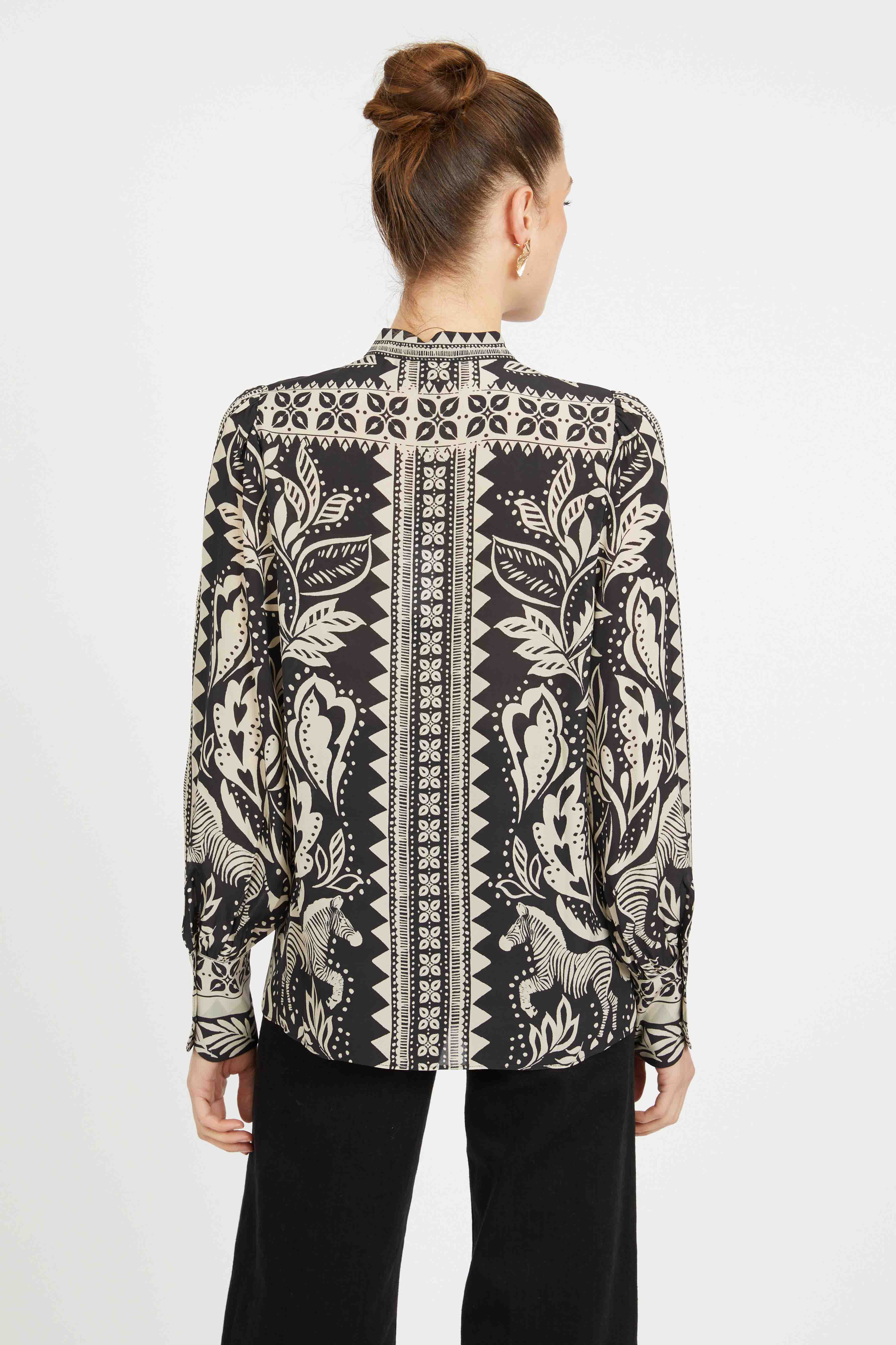Crafted in our Zebra Fern print, it combines bold black-and-ivory contrast with stylized leaves, ferns, and playful zebra motifs. Striking and versatile, it’s a statement piece that transitions seamlessly from work to weekend