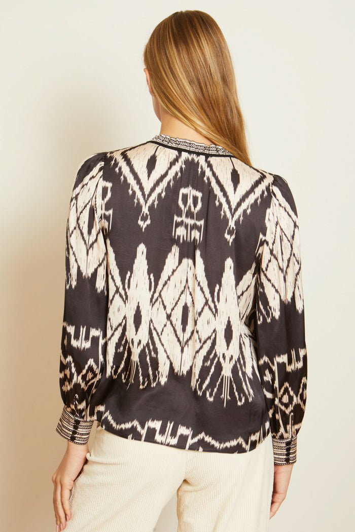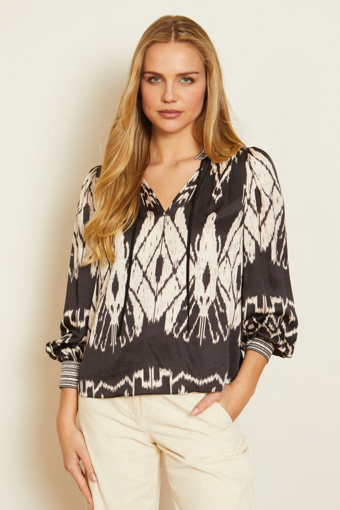 The intricate black and white Ikat Tapestry print creates a mesmerizing visual statement. Crafted from a luxurious blend of viscose and rayon, the Spencer Top offers a beautifully soft drape and effortless comfort, making it a perfect choice for any occasion.