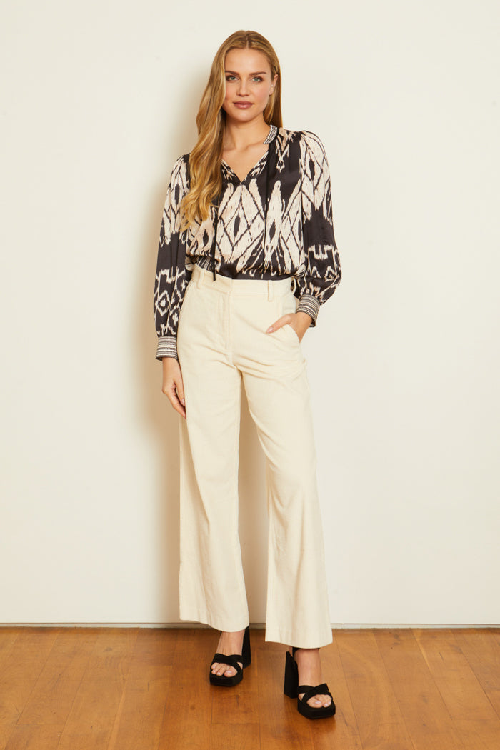 Introducing the Spencer Top, a captivating blend of comfort and sophistication. This relaxed, long-sleeve blouse features a flattering v-neckline with delicate ties that allow for adjustable cinching. The crisp standing collar of our Spencer Top adds a touch of timeless elegance.