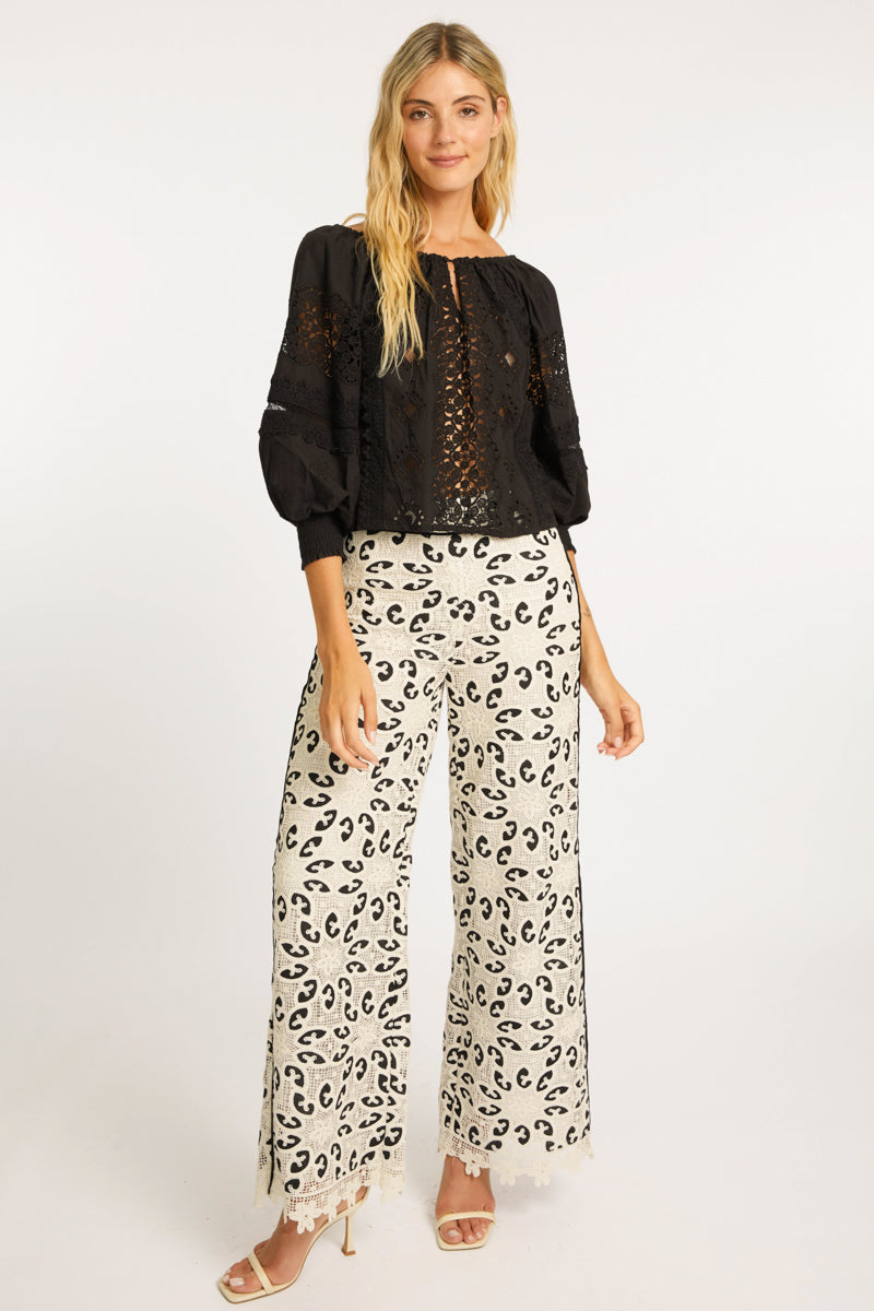 Elevate your spring wardrobe with the graceful Sybille Top, a stunning blend of elegance and comfort. This top features a feminine lace pattern along the body, paired with airy blouson sleeves for a romantic, timeless look. The sleeves are beautifully finished with smocked cuffs, while the shirring around the neckline ensures a relaxed, flattering fit. With a button-and-loop closure at the top of the V-neckline, it adds a versatile neckline design, perfect for warm spring days.