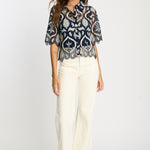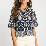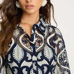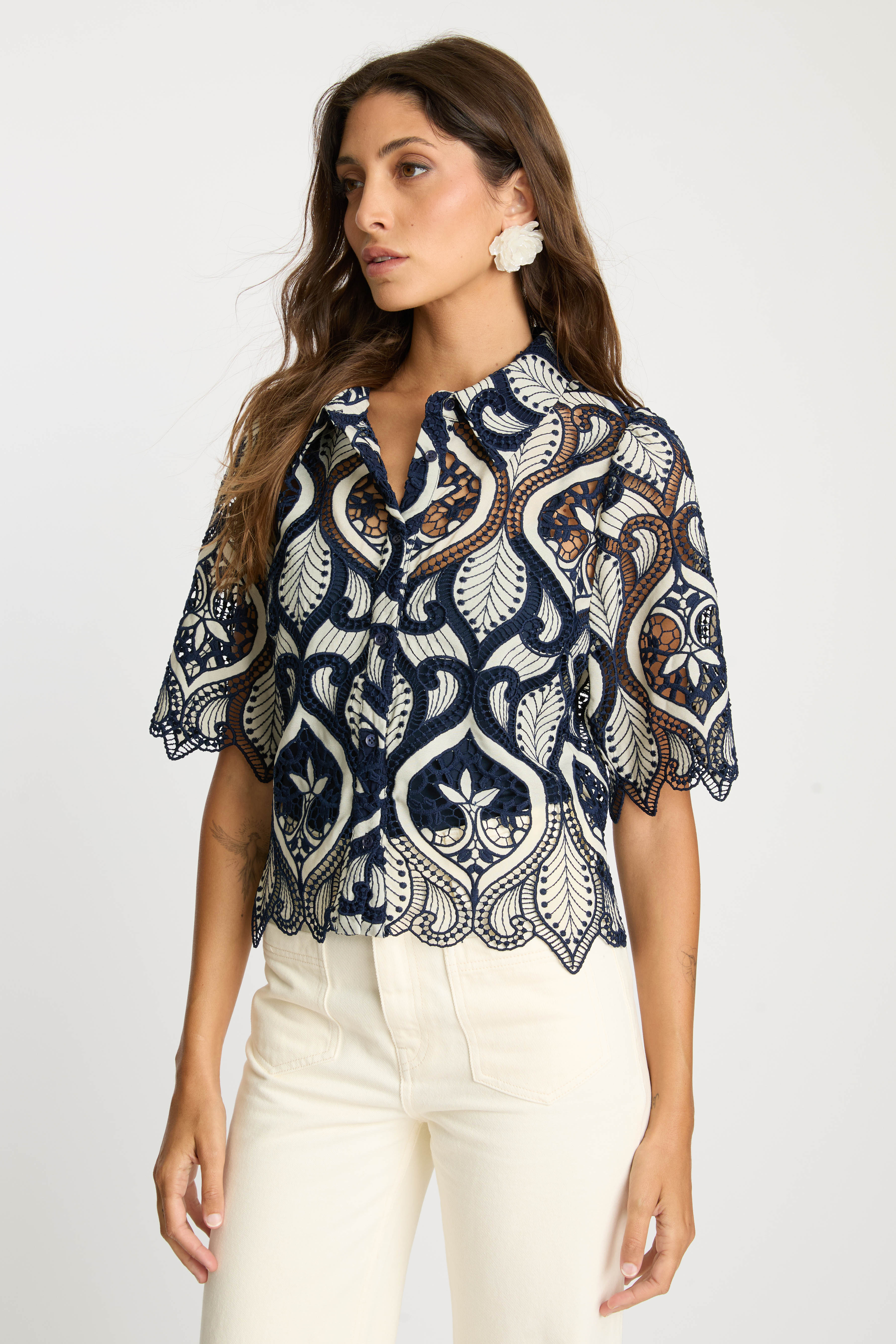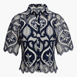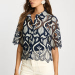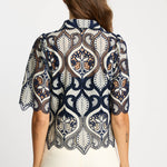 Where artful detail meets everyday elegance, the Tay Top is a striking blouse designed to elevate any wardrobe. Crafted from delicate navy and cream lace, the intricate pattern evokes the timeless beauty of vintage lacework, with swirling paisley and floral motifs that create rich texture while maintaining a light, airy feel.