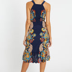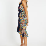 The skirt falls into a tiered, asymmetrical hemline with cascading ruffles that move gracefully with every step. Made from viscose fabric, the dress highlights rich hues of burnt orange, golden yellow, dusty teal, and ivory—balanced by graceful cheetahs and floral motifs that capture the wild-meets-whimsy spirit of the Cosmic Cheetah print.