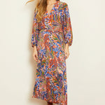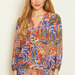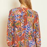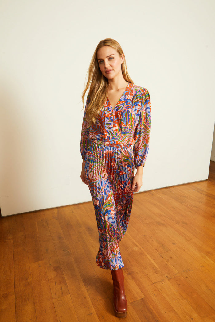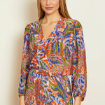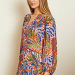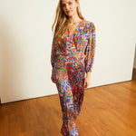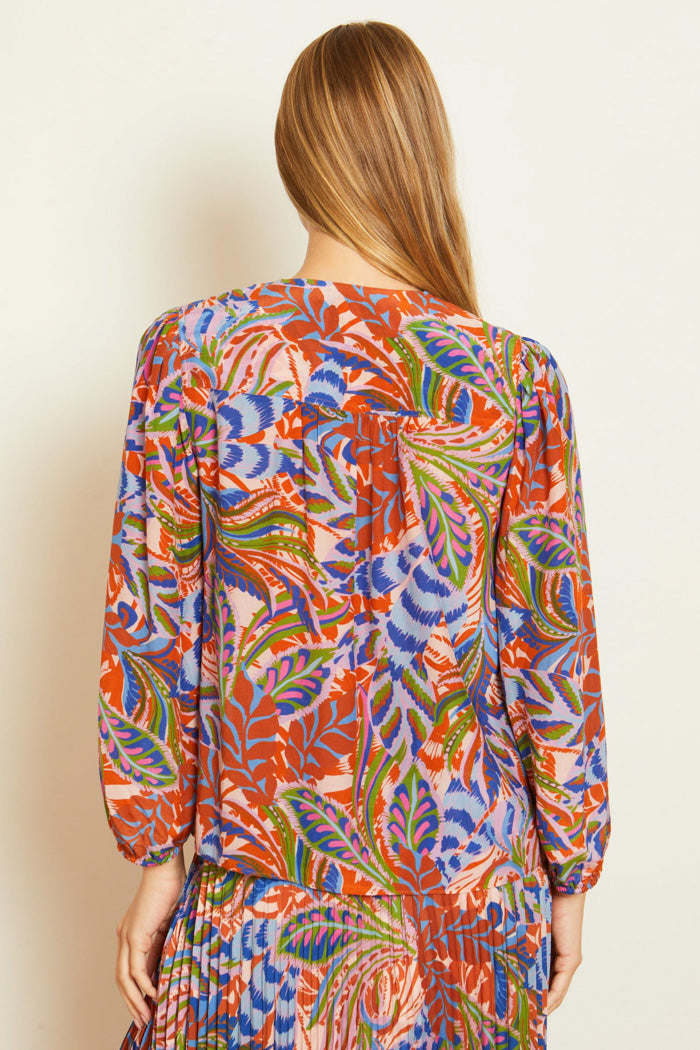 The Yvonne Top offers a touch of bohemian elegance with its long sleeves and relaxed silhouette. Made from a luxurious blend of modal and silk, it drapes beautifully and features elastic cuffs on long sleeves for adjustable comfort. The center front pleat adds a subtle bohemian touch, while the captivating La Boheme print, a hand-painted tossed leaf motif in shades of blue and red, makes Yvonne a statement piece.