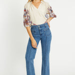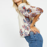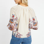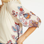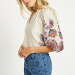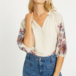 Blouson elbow-length sleeves add volume and movement, while our signature Woodblock Bloom pattern at the sleeves brings a bold, artistic flair. A soft ruffle traces the V-neckline, adding a flirty, feminine touch that makes this top perfect for both casual outings and dressed-up moments. Easy to style and endlessly versatile, the Zara Top is a standout piece with timeless charm and subtle drama.